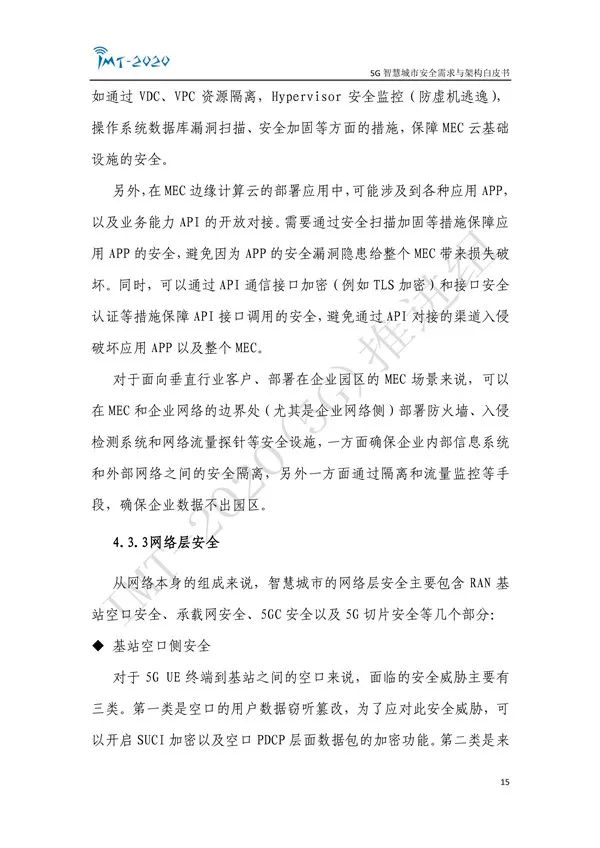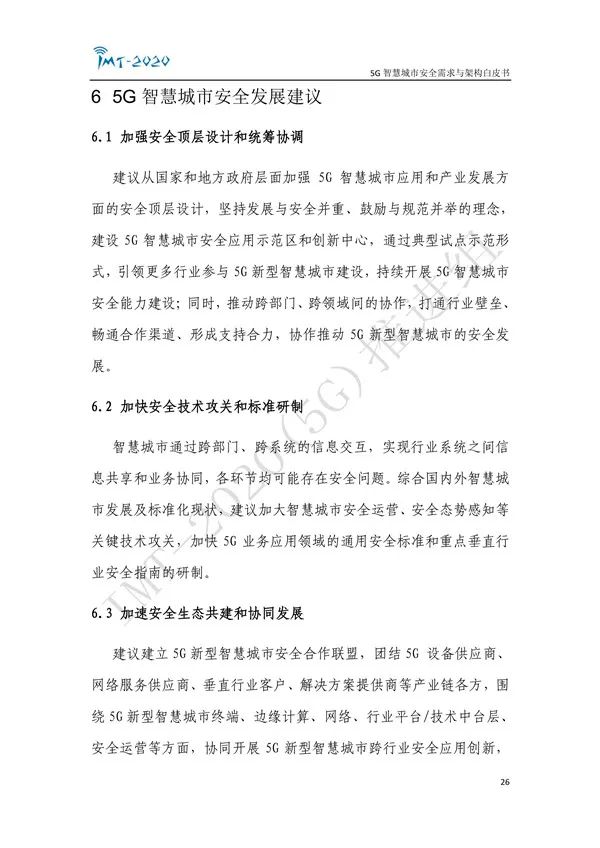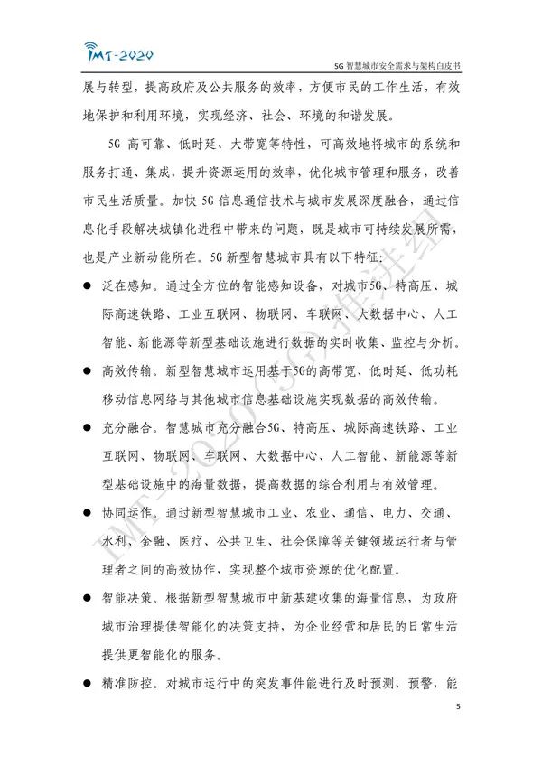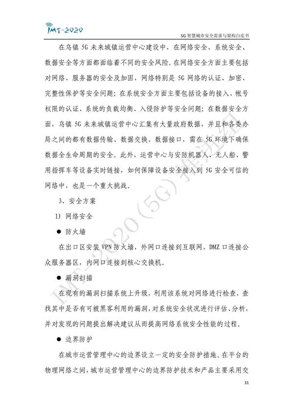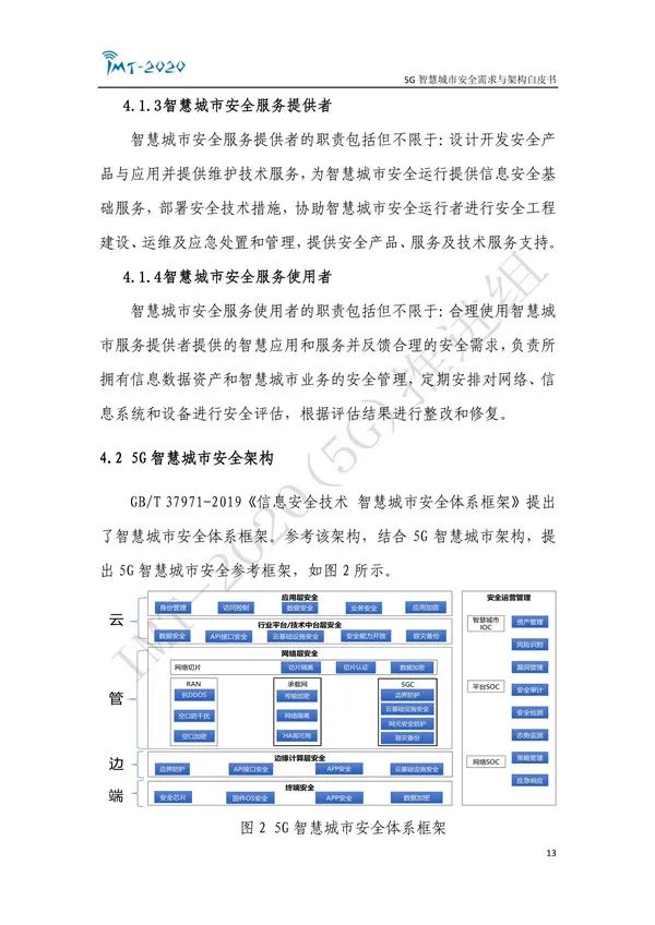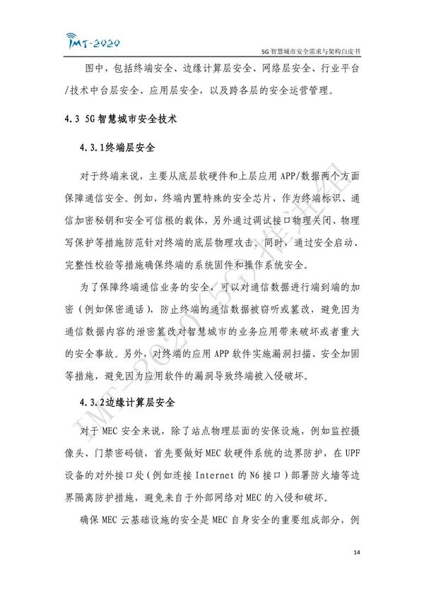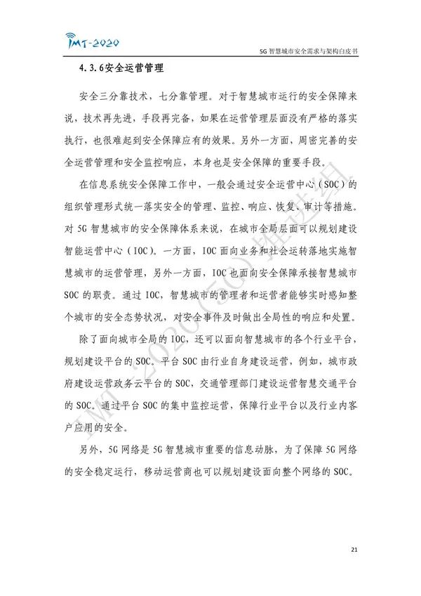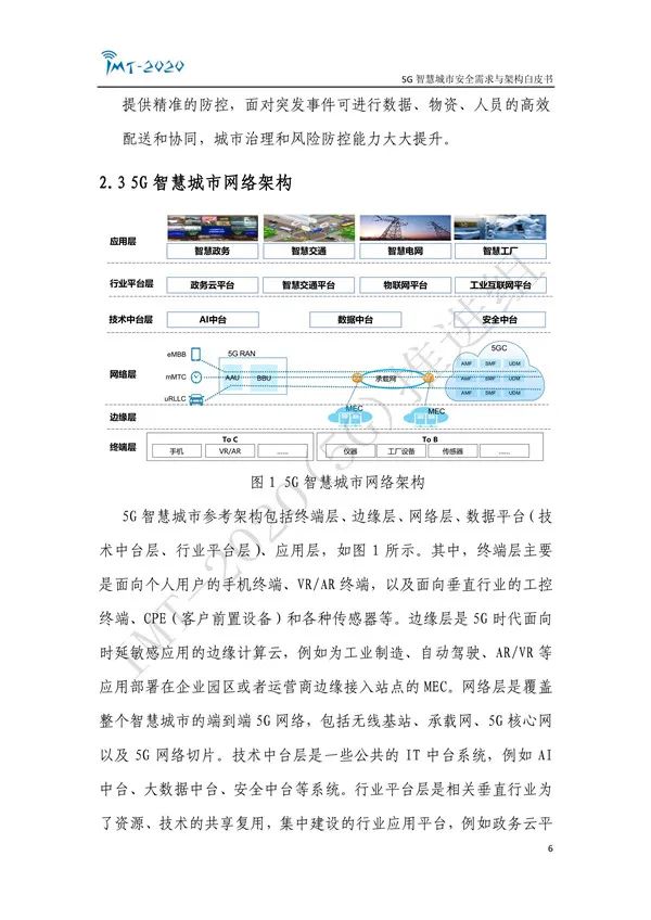 白皮书指出,5G技术的应用给智慧城市发展注入新动能的同时,也会带来新的安全风险。针对5G智慧城市的安全需求,白皮书提出了5G智慧城市安全参考架构,架构中涵盖终端层、边缘计算层、网络层、行业平台/技术中台层、应用层、安全运营管理层,并针对每层给出了安全实施建议,建议城市的管理者和建设者在每一层部署相应的安全能力,以确保5G智慧城市各项业务安全运行。