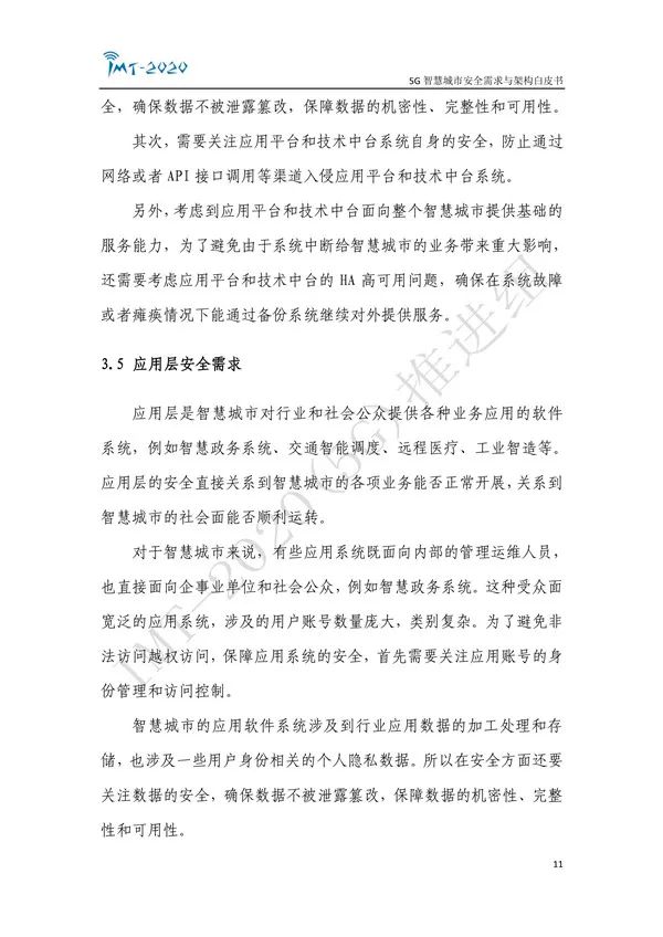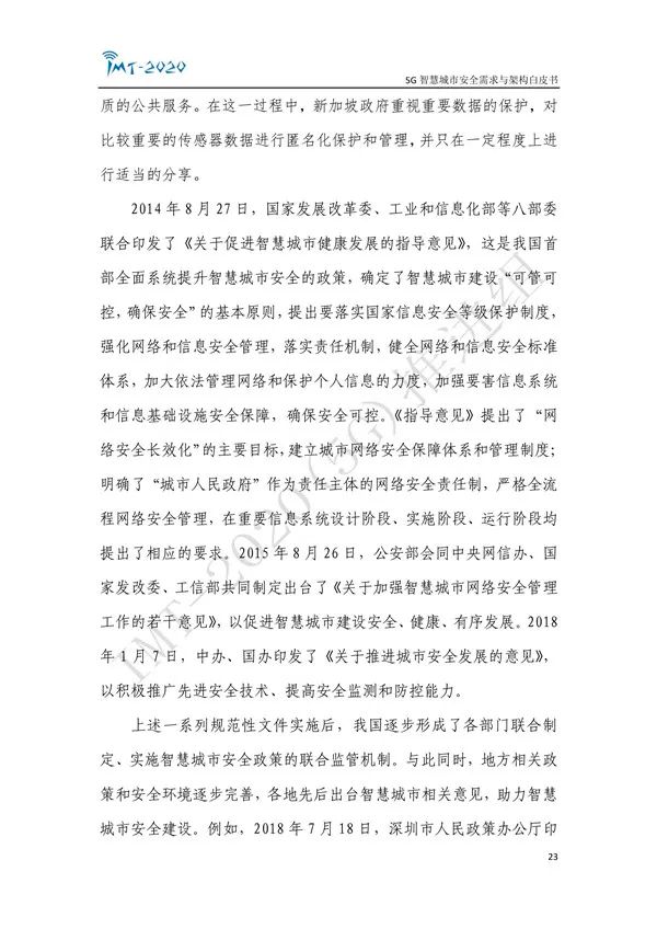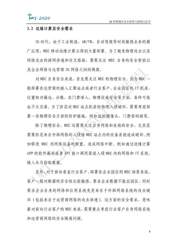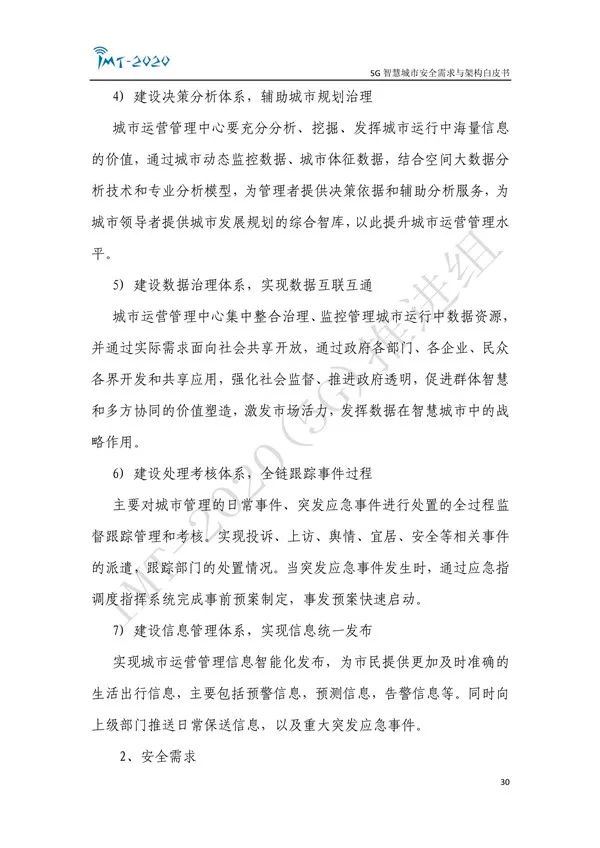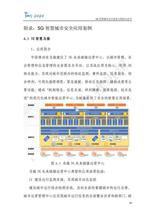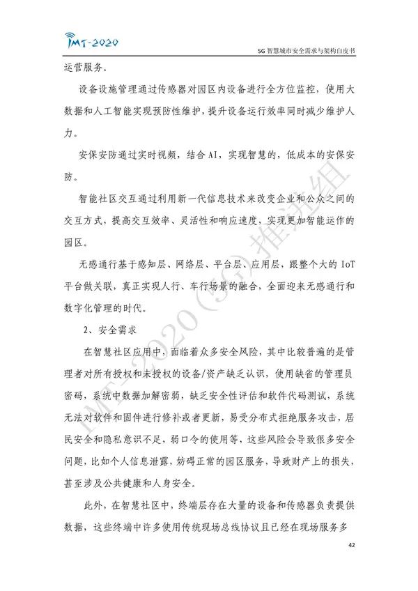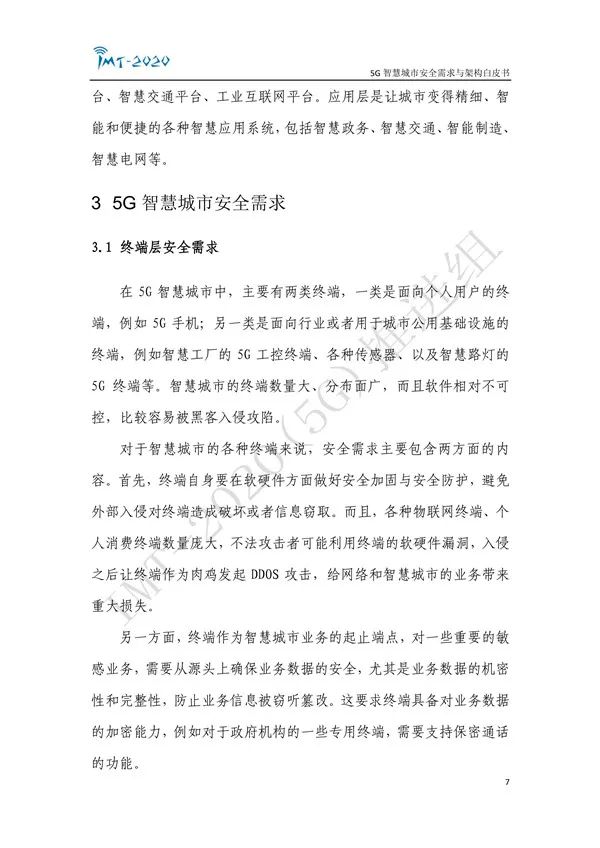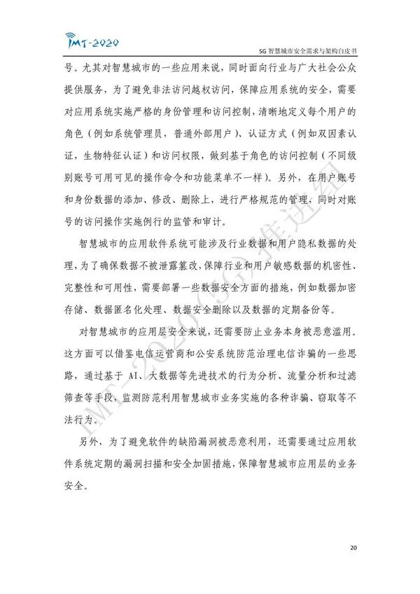 白皮书指出,5G技术的应用给智慧城市发展注入新动能的同时,也会带来新的安全风险。针对5G智慧城市的安全需求,白皮书提出了5G智慧城市安全参考架构,架构中涵盖终端层、边缘计算层、网络层、行业平台/技术中台层、应用层、安全运营管理层,并针对每层给出了安全实施建议,建议城市的管理者和建设者在每一层部署相应的安全能力,以确保5G智慧城市各项业务安全运行。